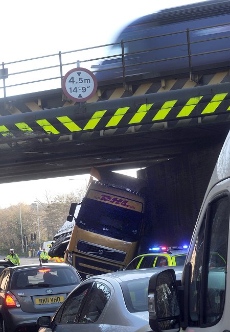 For the second time this year, traffic in Wootton Bassett road was severely disrupted after a lorry struck the railway bridge near DFS.